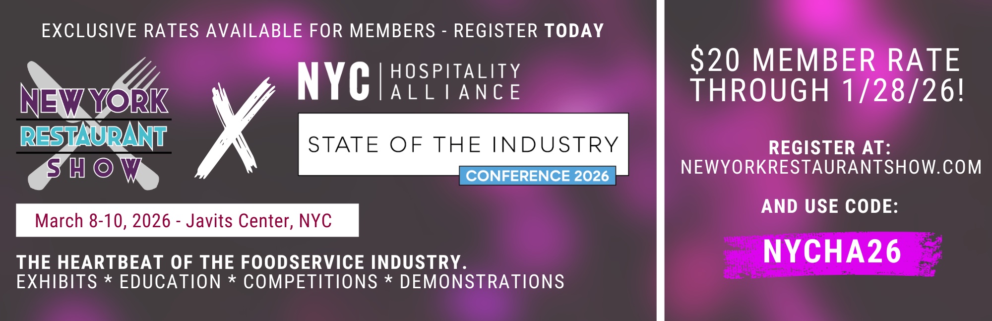 The NYC Hospitality Alliance is thrilled to announce the return of our annual State of the Industry Conference taking place at the New York Restaurant Show on March 8-10 at the Javits Center.
