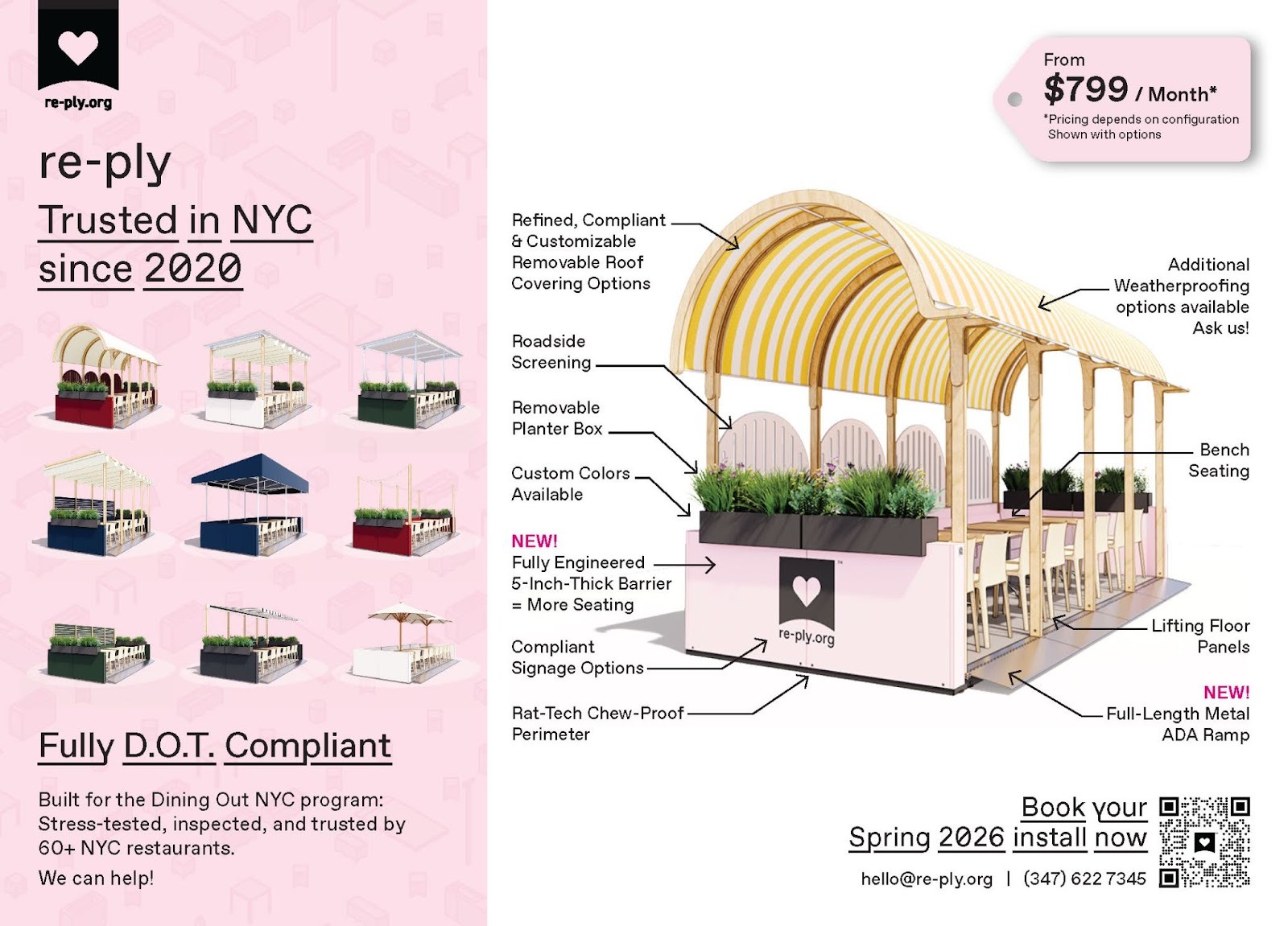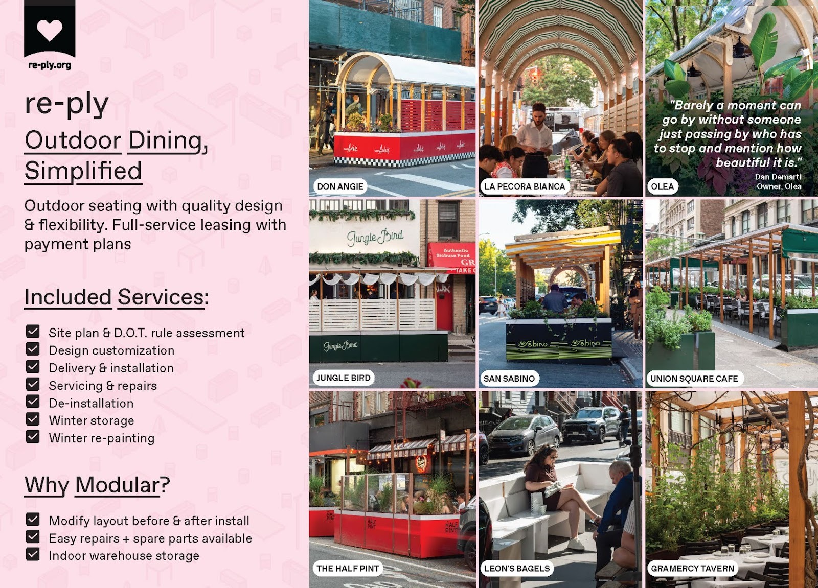 Each project includes site plan and rule assessment, installation, servicing, and winter storage, making re-ply the city’s most complete turnkey solution. Customizable roof, screening, and signage options allow every space to reflect the character of its restaurant, while modularity ensures easy maintenance, repair and reconfiguration.